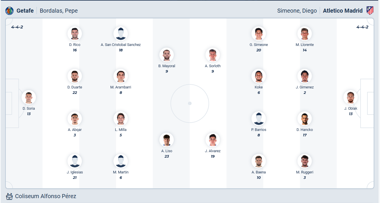 Getafe đang đứng thứ 8 trên bảng xếp hạng, so với vị trí thứ 13 mùa trước thì đội bóng của HLV José Bordalás đang chơi tốt hơn khá nhiều. Ở 5 vòng gần nhất họ thắng 2, thua 3, một phong độ không ổn định và cần chơi tốt hơn để tối thiểu giữ được vị trí hiện tại của mình. Sau trận thua ở vòng đấu trước thì Getafe cần một kết quả tốt ở vòng đấu thứ 13, tuy nhiên trước đối thủ đang có phong độ cao như Atletico Madrid thì xem ra cơ hội có điểm không cao. Nhiều khả năng Getafe sẽ phải nhận thêm một trận thua nữa.