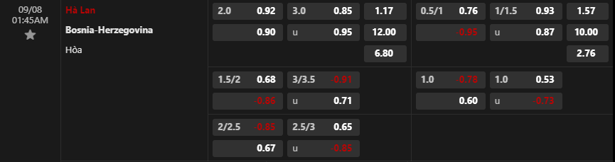 Tỷ lệ kèo Hà Lan vs Bosnia & Herzegovina